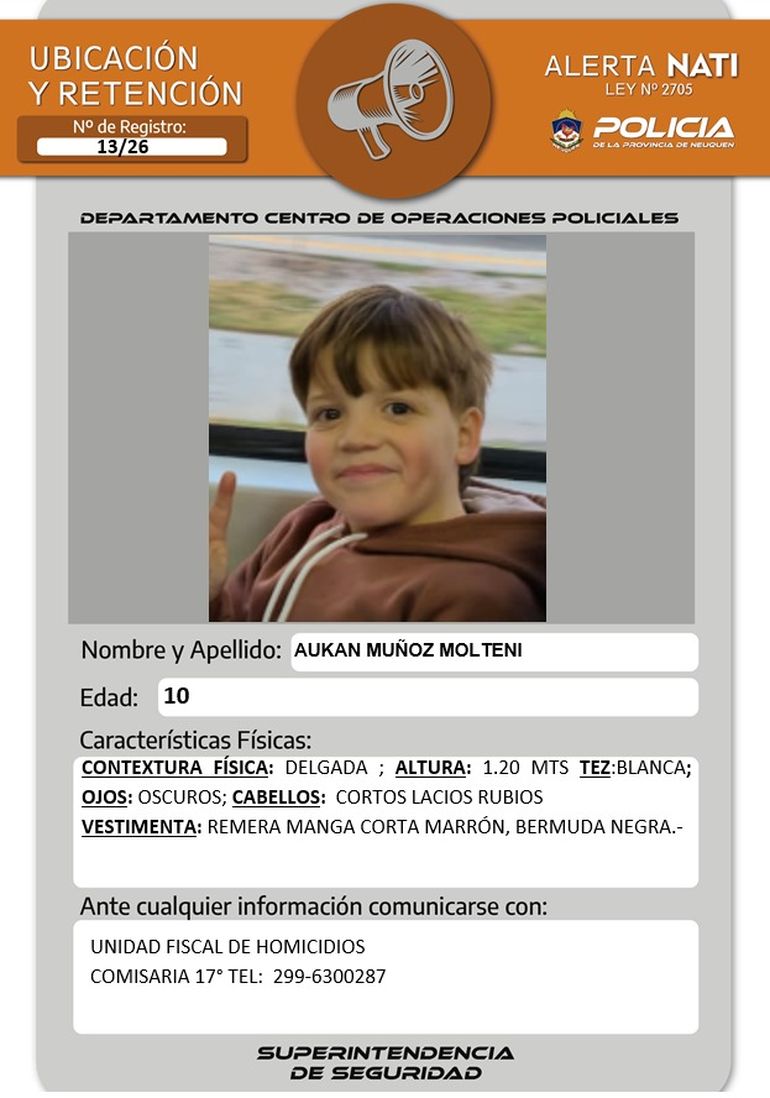 Se trata de Aukan Muñoz Altemi. El niño mide 1,20 metros, es de tez blanca, ojos oscuros y cabello corto lacio rubio. Al momento de ausentarse, vestía una remera marrón y bermuda negra. Por el momento, no trascendió información sobre cuándo fue la última vez que se lo vio.