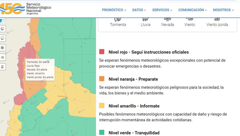 El Servicio Meteorológico Nacional (SMN) advirtió que rige una alerta amarilla en Neuquén por lluvias fuertes por la mañana con probabilidad de precipitaciones entre un 40 y 70%. La temperatura será de 9 grados con viento de moderado a fuerte y ráfagas entre 51 y 59 kilómetros por hora. Por la tarde se esperan lluvias aisladas (entre un 10 y 40%) con una temperatura que alcanzará los 14 grados y viento de leve a moderado con ráfagas de hasta 50 kilómetros por hora. Hacia la noche se prevén también lluvias (entre un 40 y 70%) con una temperatura que descenderá a los 7 grados y el viento que entrará en calma.