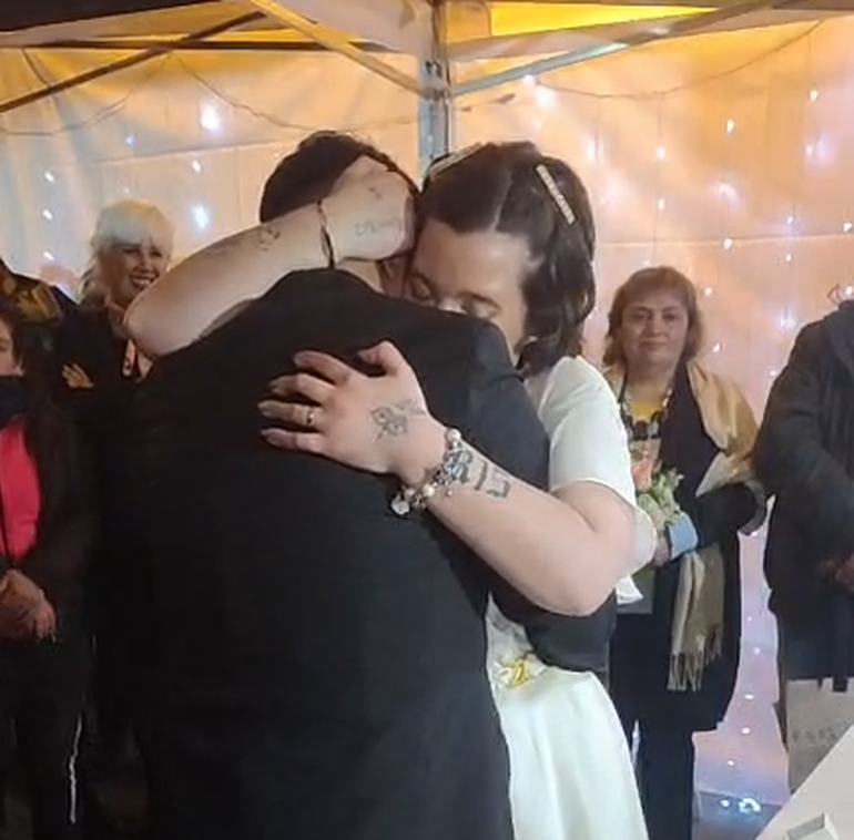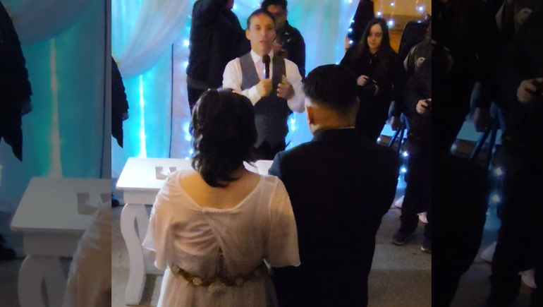 Ocurrió cerca de las 10 de la noche. El evento fue transmitido en vivo desde el Facebook de Alejandro Riffos, vecino que ayuda en el refugio "Un lugar para dormir" y se puso la organización al hombro a pedido de la pareja. Fue invitado todo el personal que trabaja en el parador y la gente que se aloja allí.