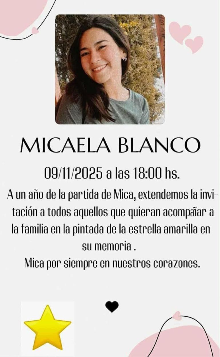 La agrupación Estrellas Amarillas de Centenario, a cargo de Viviana Huichaqueo, junto a familiares y amigos de Micaela convocan a una jornada en el lugar exacto del siniestro, a un año de la muerte de Micaela Blanco. Todavía no hay un horario definido, pese a que hay publicaciones informales de iglesias dando vuelta que sería el domingo 9 a las 18.30. Todo eso está por confirmarse. Sobre el asfalto, pintarán una estrella amarilla, símbolo de memoria, prevención y justicia vial. Las cinco puntas de la estrella representan ley, educación, memoria, prevención y justicia.