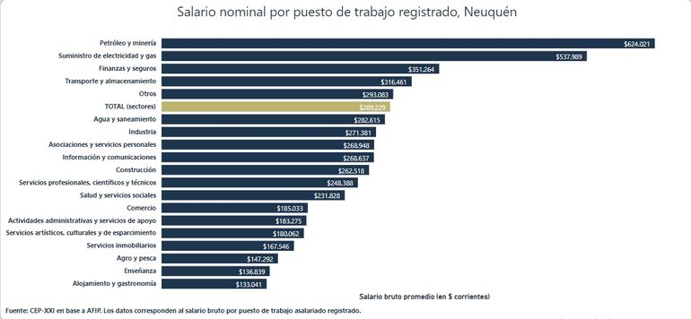 En Neuquén, las mujeres son más del 70 por ciento de la masa laboral del sector privado formal en la enseñanza y la salud y servicios sociales, mientras que ocupan menos del 10 por ciento de los puestos en las empresas petroleras, de acuerdo a la información procesada por el Ministerio de Trabajo de la Nación en base a los datos de la AFIP. El salario nominal por puesto de trabajo en el sector petrolero equivale a cinco sueldos de la enseñanza y dos y medio de la salud y servicios sociales.