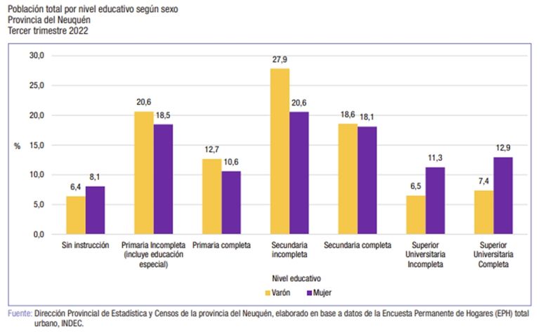 Las mujeres también tienen mejor porcentaje que los hombres respecto al paso por alguna carrera universitaria. El 11,3 por ciento presenta estudios superiores incompletos frente al 6,5 por ciento de los varones, según los datos presentados por la Dirección Provincial de Estadísticas y Censos de Neuquén en base a la Encuesta Permanente de Hogares del tercer trimestre del año pasado.