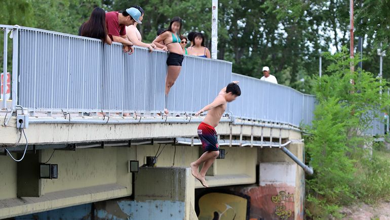 Con las temperaturas extremas de estos últimos días se volvieron a registrar escenas de peligro en el puente que comunica las calles Río Negro, Democracia con la Isla 132. Ante la mirada de los adultos, los adolescentes no se sienten intimidados y se enfrentan al riesgo de caer mal y lamentarse después.