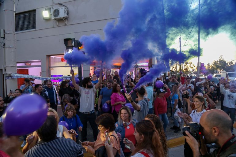 Banderas argentinas, también el clásico color amarillo que acompañó la campaña, y el violeta de Arriba Neuquén, su expresión local, pintan las calles neuquinas y el monumento a San Martín.