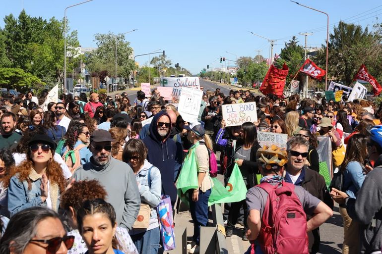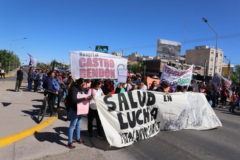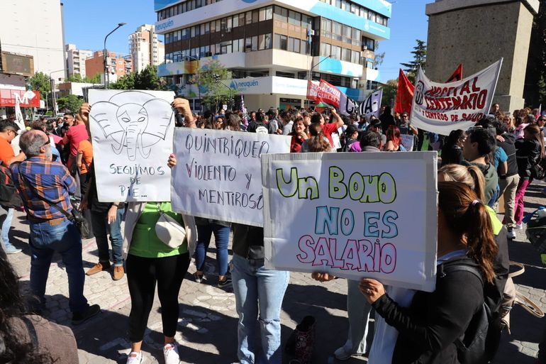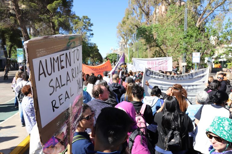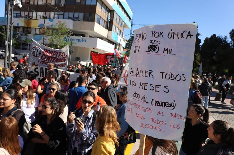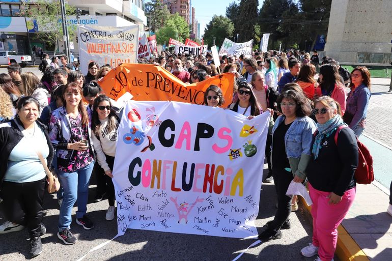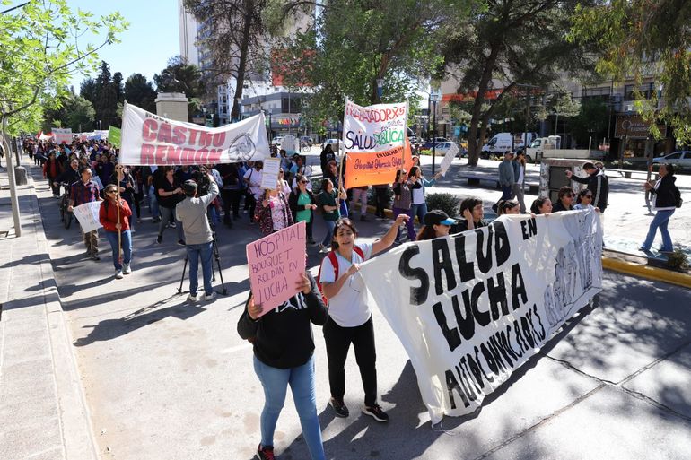 Trabajadores de distintos sectores de la salud pública y de ATEN Capital participan de una marcha en el centro de Neuquén para expresar su repudio a los incidentes violentos ocurridos durante la asamblea de ATE y sentar su postura en defensa de los salarios del sector estatal.