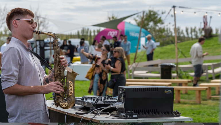 La tarde comenzó con la energía de Luniv Music Sax & DJ, un formato que mezcla música electrónica con saxofón en vivo, creando una atmósfera festiva ideal para disfrutar entre copas y viñedos.