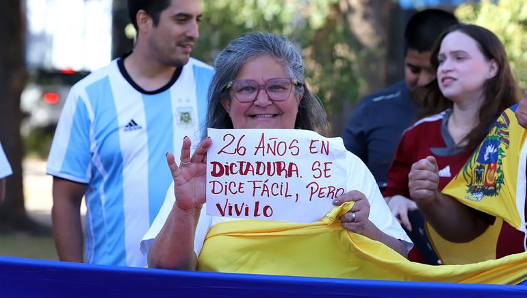 Los manifestantes se encontraron con sus compatriotas en el epicentro neuquino. Abrazos y emoción a flor de piel entre los residentes en la ciudad. Algunos llevaron carteles, entre los que se podían leer: "Ya no vivo en mi país, pero mi país siempre vivirá en mi corazón", otros hacían destacaban que estén presos tanto Maduro como la expresidenta Cristina Fernández. Otros referenciaban al régimen chavista: "26 años de dictadura se dice fácil, pero vivilo". En tanto que el que más se repitió fue el de "Venezuela libre".