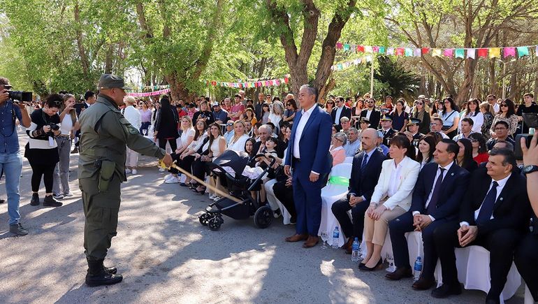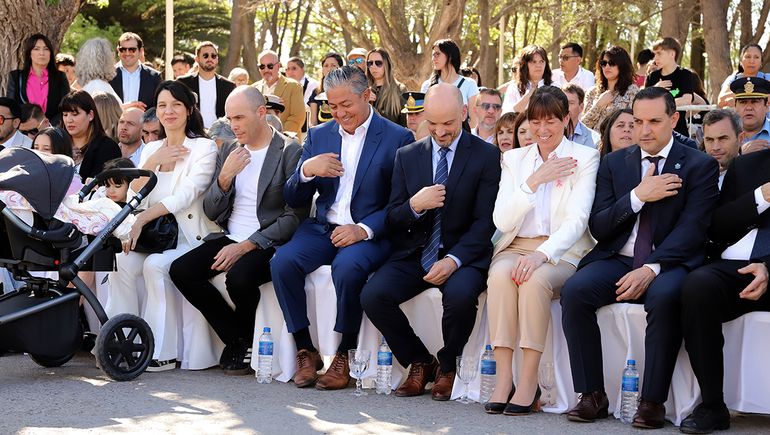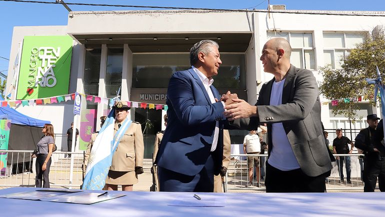 El punto de encuentro de las autoridades estuvo ubicado frente al palacio municipal, sobre calle Intendente Pons. Tras el saludo y revista de tropas, se entonaron los himnos nacional y provincial. Luego, ambos mandatarios firmaron dos convenios para la construcción del pavimento en los barrios 173 Viviendas y Ruca Niyeu.