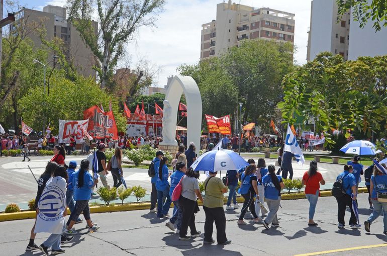 Minutos previos a las 15 de este miércoles se concentraron en las inmediaciones del monumento al General San Martín para luego recorrer las calles céntricas de la ciudad de Neuquén.