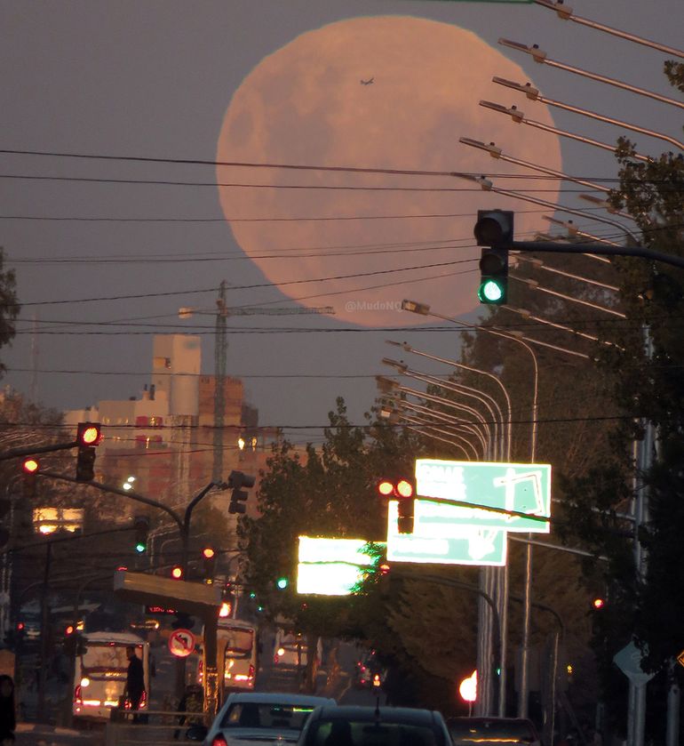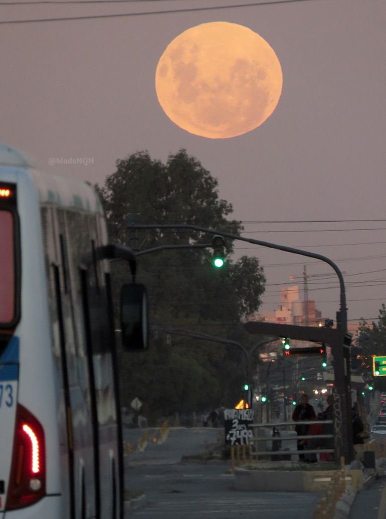 El fotógrafo de LMNeuquén, Sebastián Fariña Petersen, capturó el momento de plenilunio desde una de las avenidas más transitadas de Neuquén, la Avenida del Trabajador. El reportero eligió ese punto de la ciudad por su traza oblicua y la posibilidad de observar el mejor ángulo para la salida de la luna.