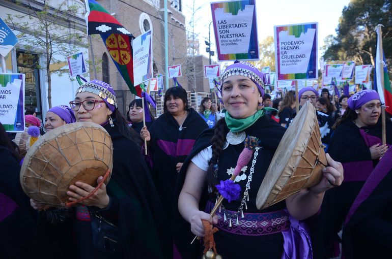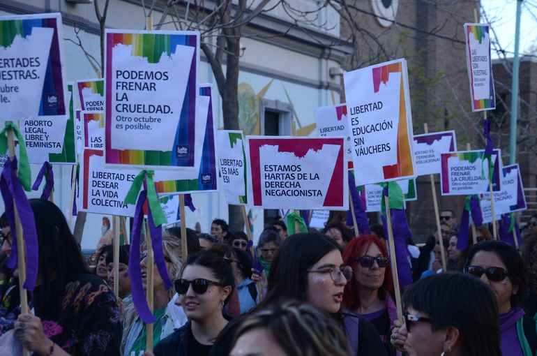 “Ni un paso atrás, ni Milei ni Bullrich", enfatizaron las dirigentes feministas en la convocatoria a la movilización, que congregó cientos de personas en las calles céntricas de la capital neuquina.