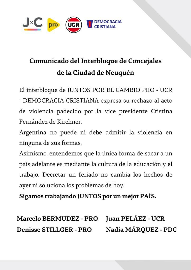 "El interbloque de Juntos por el Cambio-PRO-UCR-Democracia Cristiana expresa su rechazo al acto de violencia padecido por la vicepresidenta". Y agreraron: "Argentina nopuede ni debe admitir la violencia en ninguna de sus formas".