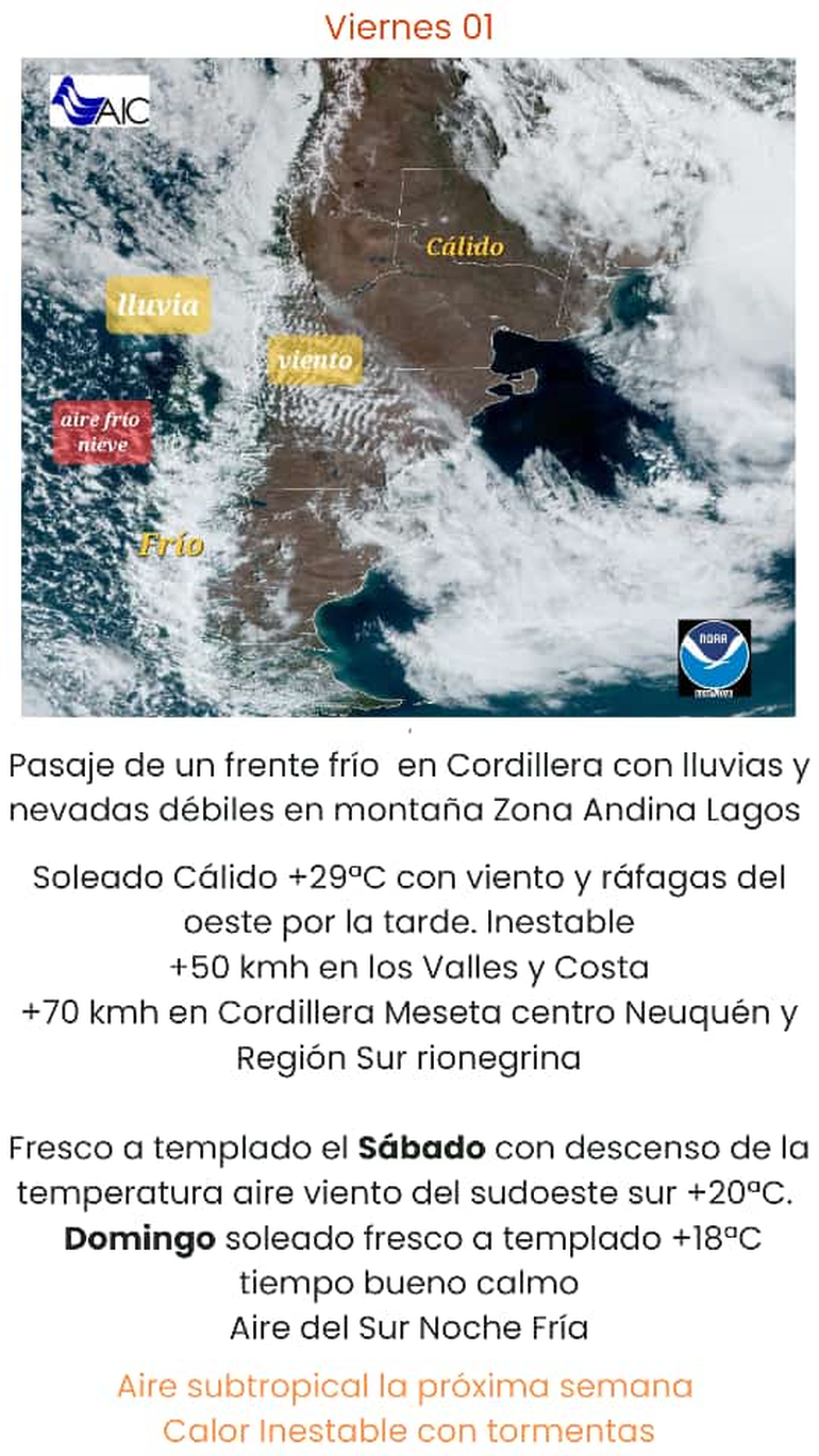 Desde la Autoridad Interjurisdiccional de las Cuencas de los ríos Neuquén, Limay y Negro (AIC) anticiparon que este fin de semana ingresaba un frente frío con lluvias y nevadas en la cordillera; y viento fuerte en los valles y meseta.
