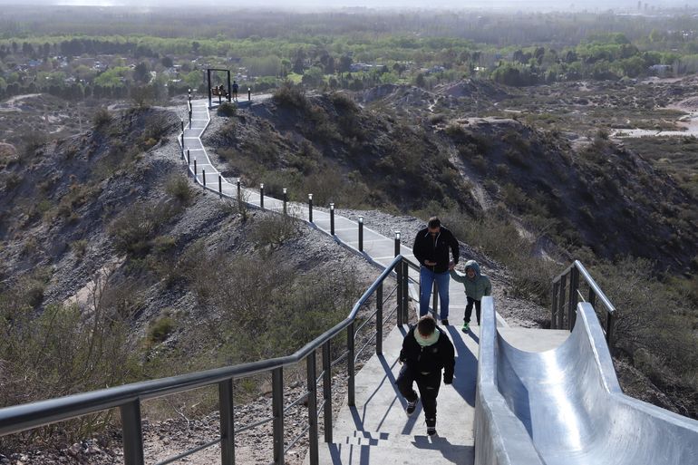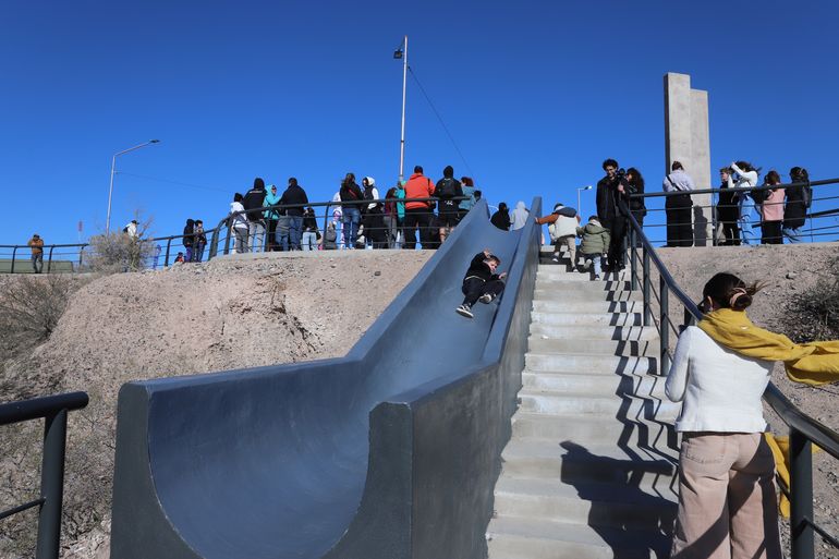 Todo pensado. No dejaron nada al azar. El Balcón del Valle quedó inagurado este sábado y suma una atracción para los niños y niñas que visiten el lugar. Se trata de un tobogán de cemento que les evita bajar los primeros peldaños de una escalera que comunica con el paseo, mirando a la barda neuquina.