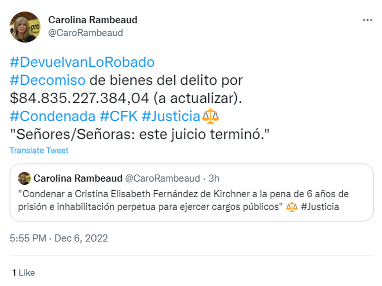 Luego de más de tres años de juicio oral y público, el Tribunal Oral Federal N°2 condenó a la vicepresidenta a seis años de prisión e inhabilitación especial perpetua en la causa Vialidad, al encontrarla culpable del delito de administración fraudulenta en perjuicio de la administración pública al direccionar contratos de obras a las empresas de Lázaro Báez en Santa Cruz.