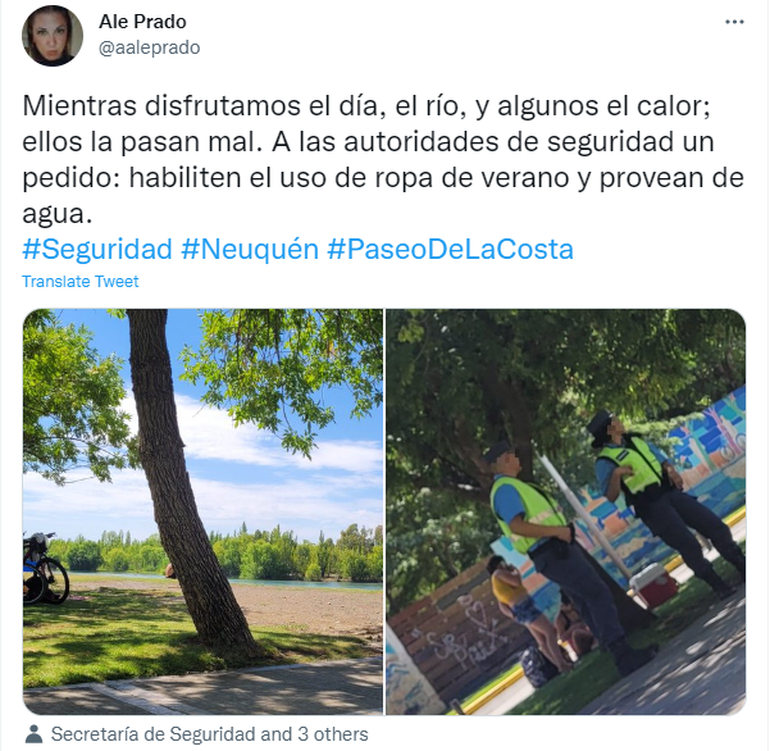 El debate inició en las redes sociales, cuando una neuquina subió a su cuenta de Twitter una imagen en la que puede verse a dos efectivos realizando un rondín en la zona del Paseo de la Costa con su traje habitual, en el que pueden apreciarse los borceguíes reglamentarios y gruesos pantalones. Al mismo tiempo que a su alrededor se ve a las personas disfrutando de las altas temperaturas con ropa corta.