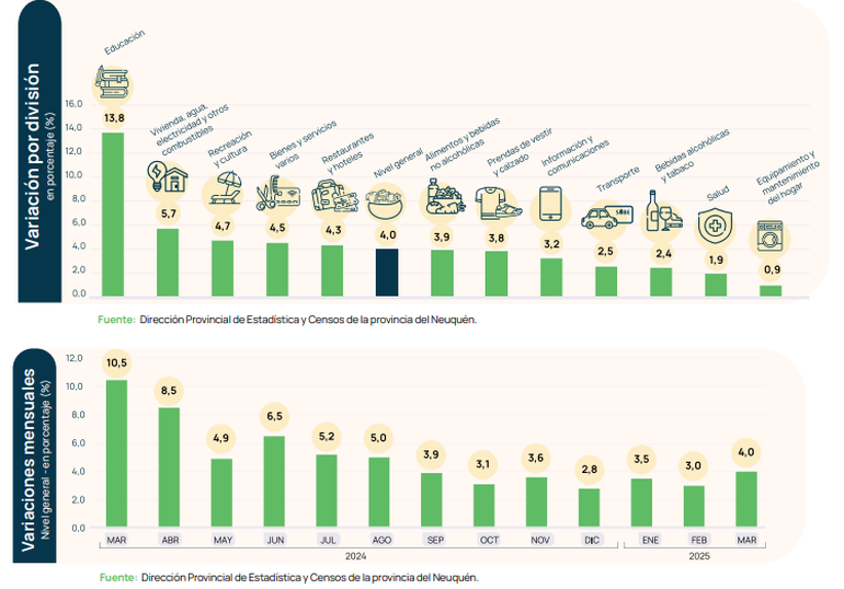 En marzo, la inflación en Neuquén fue del 4 por ciento, una cifra por encima del 3% del mes pasado. La acumulada del primer trimestre del 2025 fue del 10,9 por ciento. Así lo difundió este viernes la Dirección de Estadísticas y Censos de la Provincia.