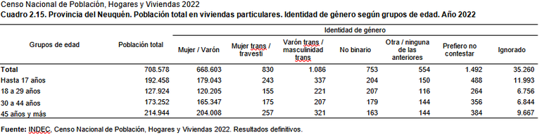 Del total de personas no binarias, 207 tienen entre 18 a 29 años; 204 hasta 17 años; 179 comprenden el rango etario entre 30 a 44 años y 163, 45 años y más. Por otra parte, los datos definitivos del Instituto Nacional de Estadísticas y Censos (Indec) informó este miércoles que en la provincia de Neuquén, 830 personas se identificaron como Mujer trans/travesti y 1086 Varón trans durante el censo.
