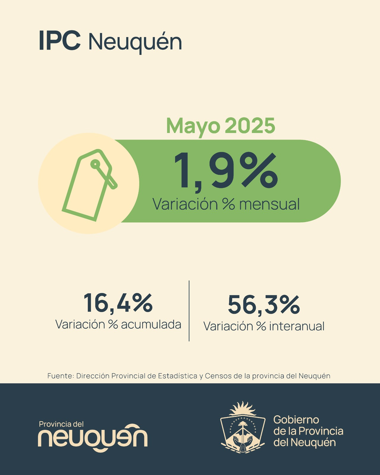 La inflación de mayo en Neuquén fue del 1,9 por ciento, una cifra por debajo del 2,9% del mes pasado. Así lo difundió este jueves la Dirección de Estadísticas y Censos de la Provincia. La acumulada del 2025 fue del 16,4 por ciento.