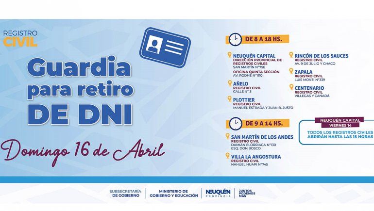 Desde la Dirección Provincial de Registros Civiles informaron que los ciudadanos podrán retirar su DNI este mismo domingo 16 de abril para concurrir a votar en las oficinas de Neuquén capital, Zapala, Centenario, Plottier, Añelo, Villa La Angostura, San Martín de los Andes y Rincón de los Sauces.