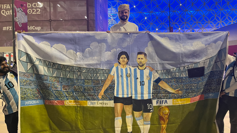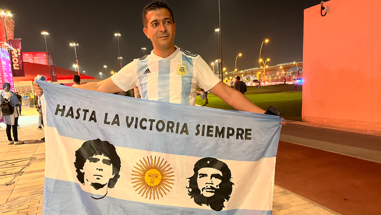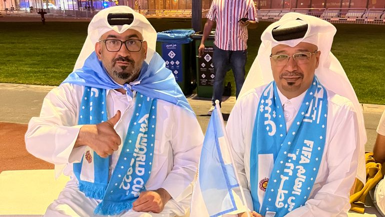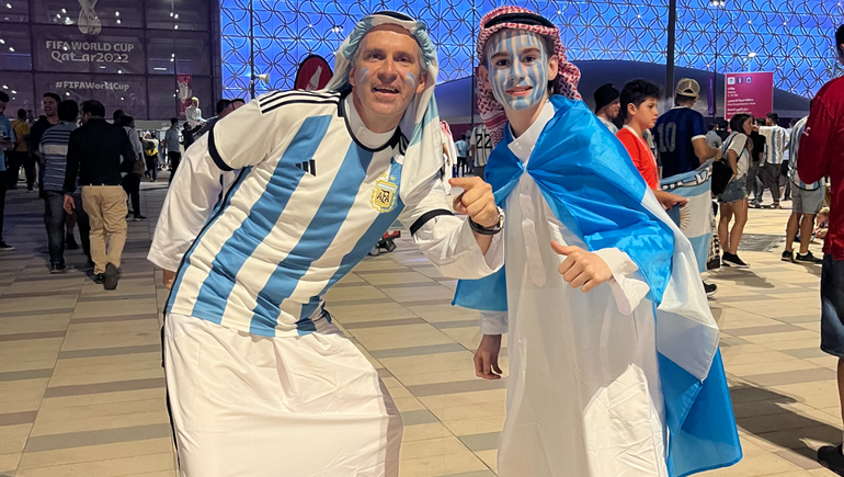 "El que no salta, es un inglés", sonó nuevamente en suelo qatarí acompañado por los bombos de un grupo de argentinos, mientras que hasta el mediocampista Rodrigo De Paul se sumó a cantar con la gente desde el centro de la cancha.