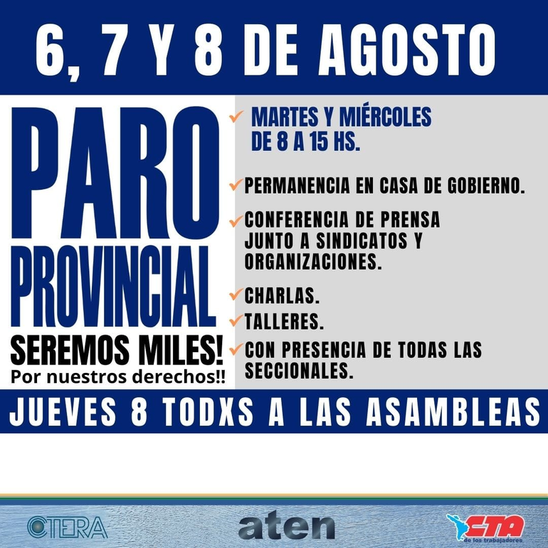 Desde este martes, los docentes de la provincia de Neuquén nucleados en ATEN llevan a cabo un paro por 72 horas aprobado en plenario para rechazar el plus salarial instaurado por el Ejecutivo provincial. También reclaman un incremento en las partidas de refrigerio y comedor y piden el cumplimiento de los acuerdos confirmados en la mesa técnica.