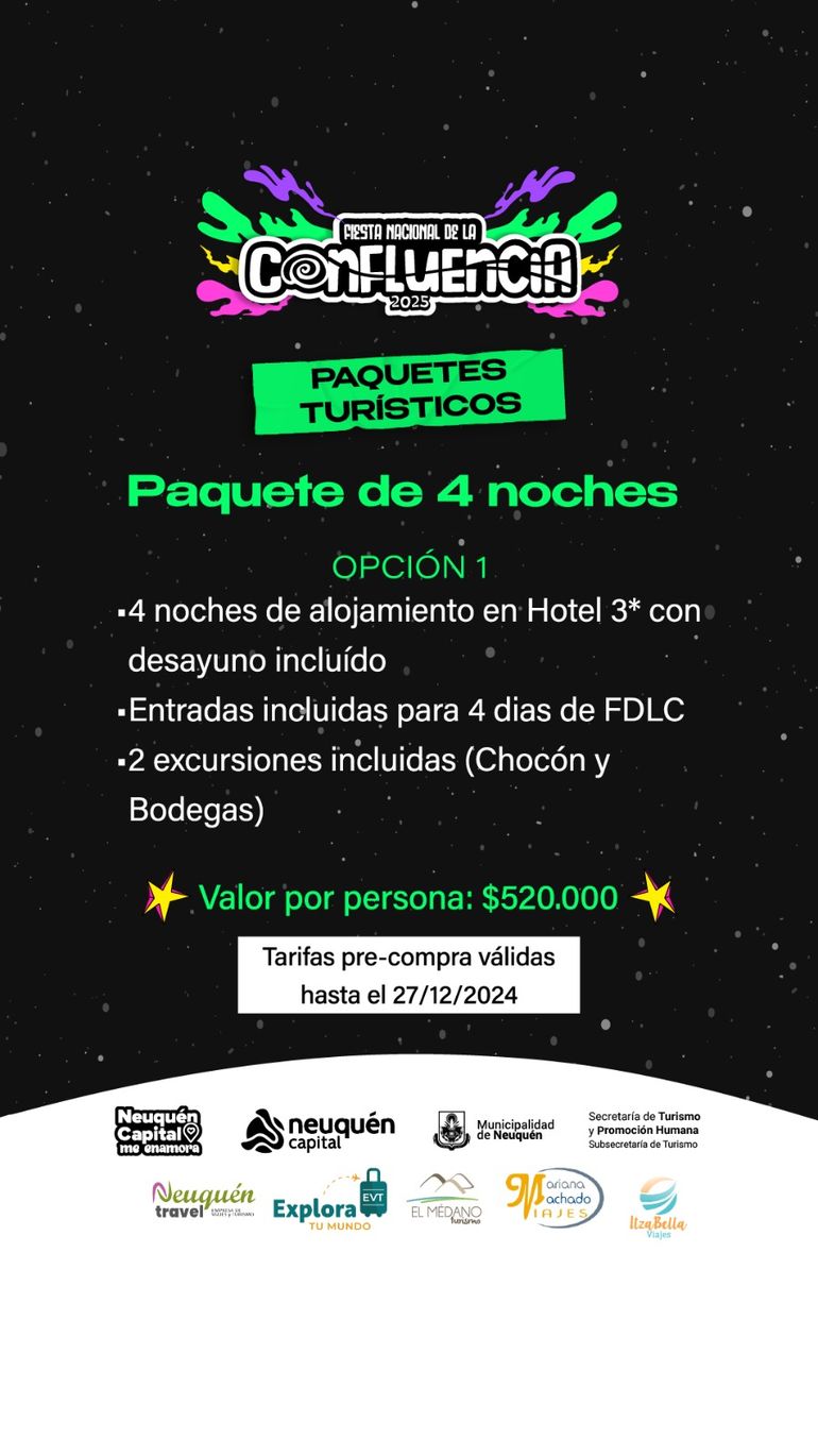 Lucía Bissi, propietaria de la agencia El Médano Turismo, contó a LMNeuquén que la idea es ofrecer al turista un paquete en donde tenga todo organizado para disfrutar de la Fiesta Nacional de la Confluencia y también pueda recorrer la ciudad. "Los precios que estamos promocionando van a estar vigentes hasta el 27 de diciembre de este año, ya que al menos las entradas van a tener otro costo el año que viene", precisó.
