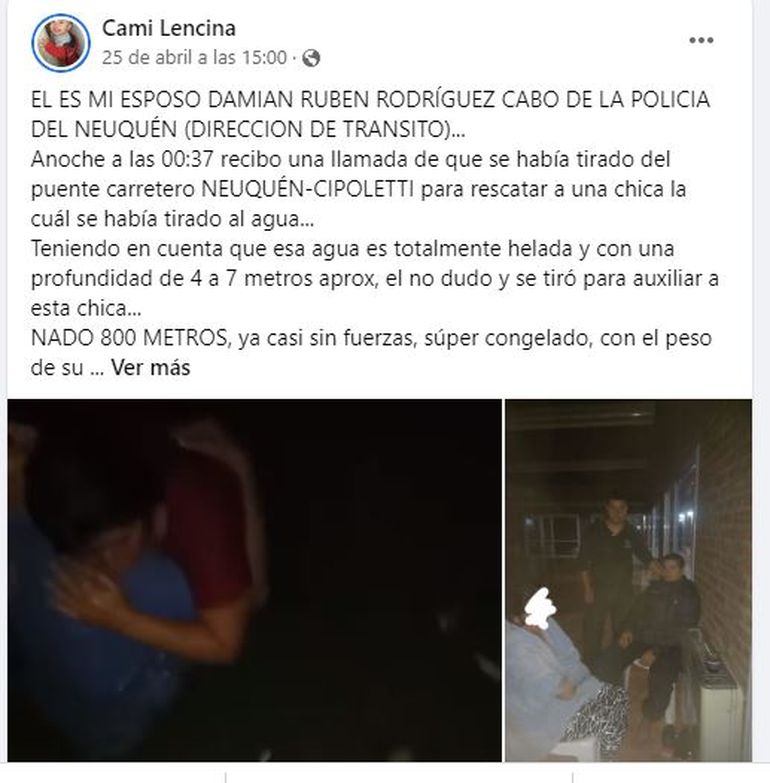 "En ese preciso momento -Damián Rodríguez- se arrojó al agua nuevamente a sacarla con éxito. Ambos fueron trasladados al hospital Castro Rendón", prosiguió. Y ahora sí metió un párrafo para el olvido: "En un principio, la atención que le brindaron a mi esposo fue pésima. Lo dejaron en una silla de ruedas, empapado, con principio de hipotermia, que si no fuera por una compañera también efectivo, que exigió que por favor lo atendieran, aún seguirían sin atenderlo. Luego de decir que fue él quien salvó a la chica, recién ahí lo atendieron bien. El doctor le dijo que no sabía y lo atendió super bien".