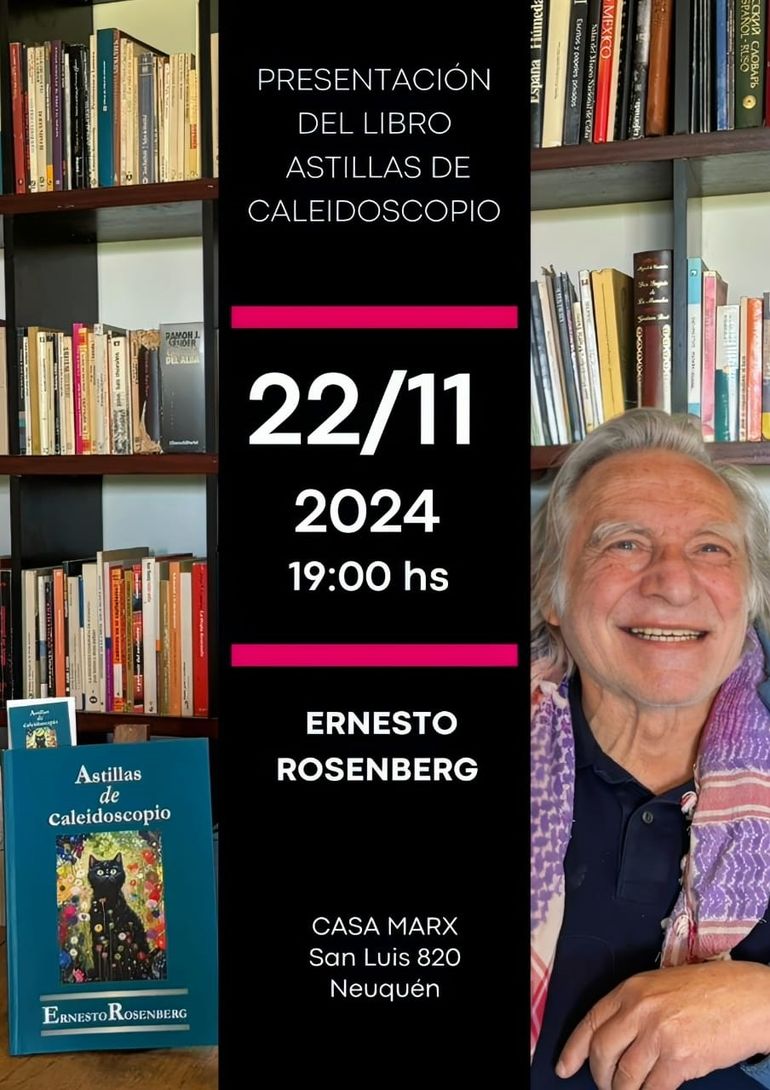 Rosenberg se autodefine como “jugador de ajedrez, fumador empedernido, cocinero, devorador de libros, poliglota, amante de las mujeres, viajero y escritor”. Y en "Astillas de caleidoscopio" describe su mirada en relación con la política, la literatura, el humor, reflexiones acerca de la salud desde una perspectiva socialista y la defensa de la causa Palestina, anunció Casa Marx de Neuquén, donde se presentará el libro.
