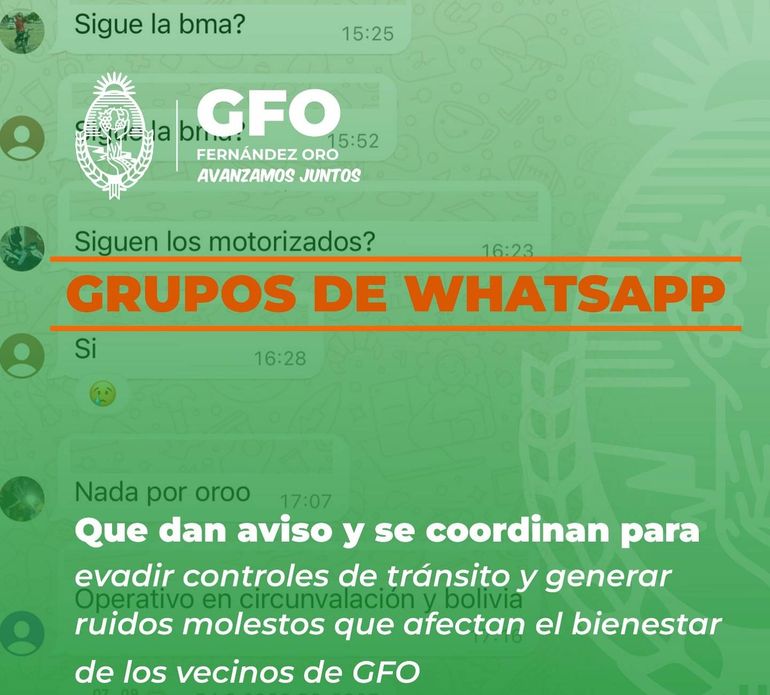 “Grupos de WhatsApp que dan aviso y se coordinan para evadir controles de tránsito y generar ruidos molestos que afectan el bienestar de los vecinos de General Fernández Oro. La Brigada motorizada de apoyo (BMA) tiene como objetivo principal garantizar la seguridad vial", repudió la Muni.