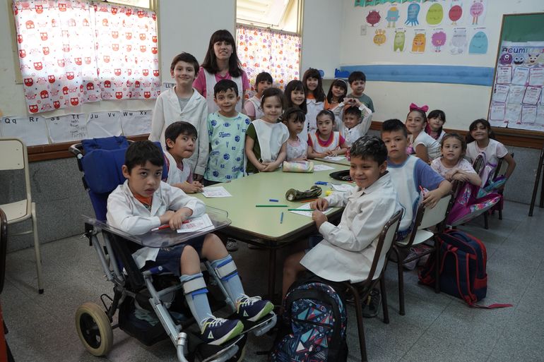 Recién un año más tarde, Diego logró acceder a la Escuela 125 y la respuesta del equipo directivo y docente fue inmediata. Se necesitaba un lugar para cambiarlo, se le adecuó un cuarto; se necesitaba una mesa que pudiera utilizar con su silla de ruedas, se adaptó una. “Si pudiésemos entender que somos todos personas y que merecemos el mismo respeto, las cosas serían más sencillas”, dice Laura Yubel, la maestra de 1° “C” al que asiste Diego, junto a otros 19 niños y niñas. “Cuando pienso en las clases, pienso en todos y todas, en contenidos que sirvan para aprender en conjunto”, explica.