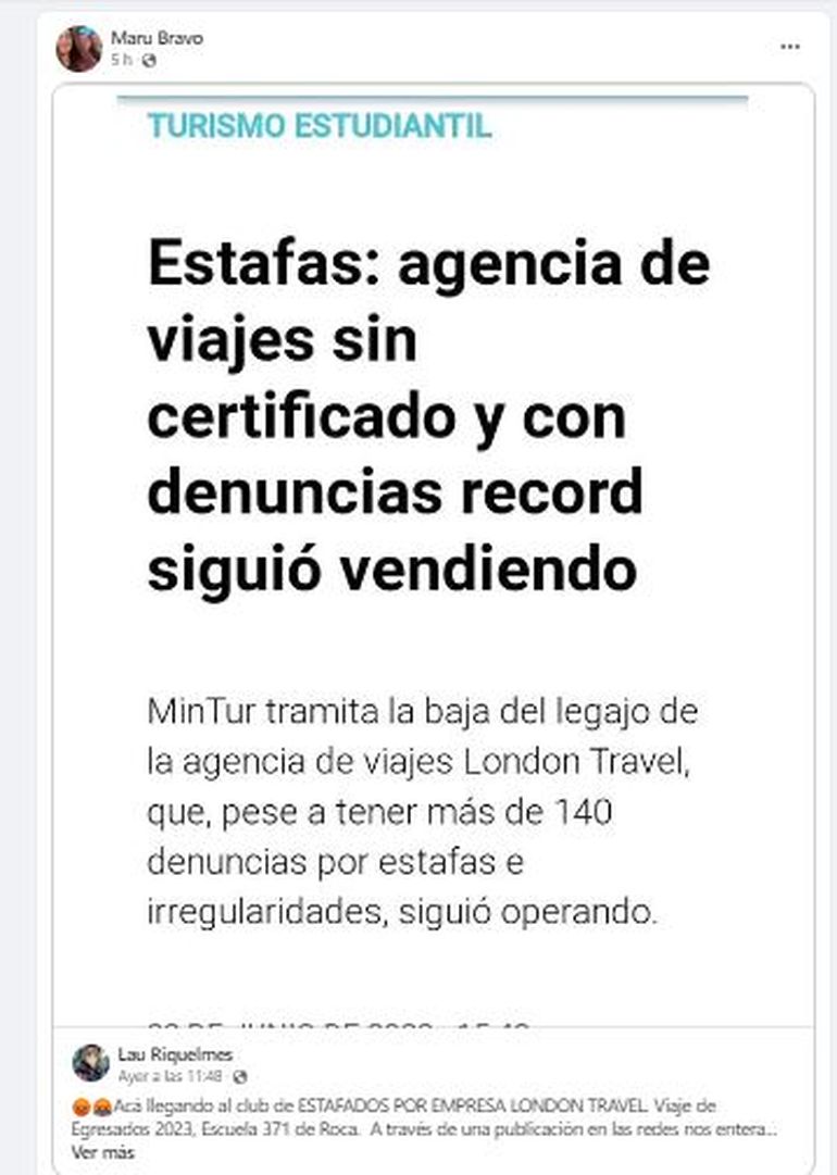 Fueron víctimas de la empresa London Travel, con más de 140 denuncias por estafas e irregulariades. Se trata del grupo de estudiantes de quinto año del CPEM 94, de Varvarco, que con mucha ilusión comenzó a pagar su viaje de egresados de fin de año con destino a Córdoba. Cuando ya habían depositado más de un millón de pesos, en cuotas, la compañía dejó de atenderles el teléfono, como hizo con otras escuelas de la provincia y Río Negro. Fue una gran estafa para todos.