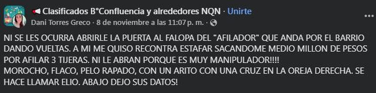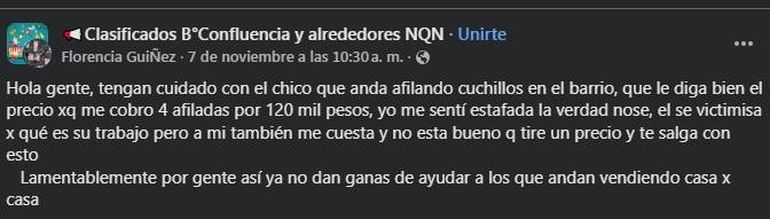La primer advertencia, fue dada el viernes pasado por una vecina de nombre Florencia, quien quiso evitar que otras personas sigan cayendo en los engaños. "Hola gente, tengan cuidado con el chico que anda afilando cuchillos en el barrio, que le diga bien el precio porque me cobro cuatro afiladas por 120 mil pesos", inicia la publicación.