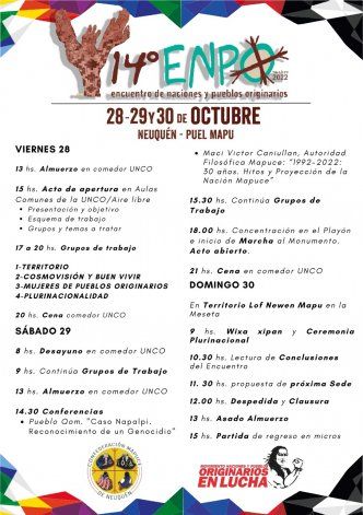 El 14° Encuentro de naciones y pueblos originarios comenzará este viernes y Neuquén es la sede elegida donde se espera que lleguen cerca de mil integrantes de comunidades mapuches, guaraníes, tehuelches, coyas, wichís, qom, entre otras. Los visitantes participarán de talleres, cuyo principal tema a discutir será la situación de sus territorios.