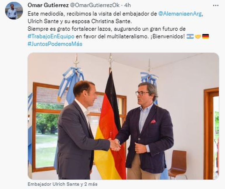 Uno de los primeros en llegar fue el embajador de Alemania, Ulrich Sante, quien este martes se reunió con el gobernador Omar Gutiérrez, en la residencia del Paseo de la Costa. Dialogaron sobre el presente y las proyecciones de la formación, que genera los recursos que el país necesita para avanzar ante la escasez de dólares.