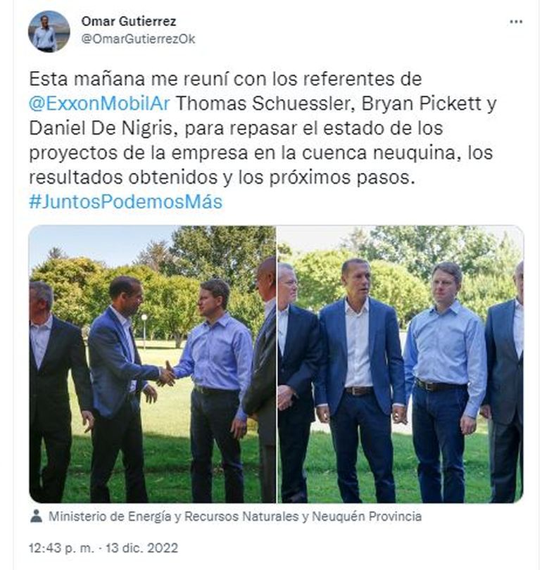 El gobernador Omar Gutiérrez recibió este martes en la residencia oficial del gobierno de la provincia, al Senior vice President de No Convencionales de ExxonMobil, Thomas Schuessler y a los gerentes generales de Central Basin y Argentina, Bryan Pickett y de Exxonmobil Exploration Argentina, Daniel De Nigris.