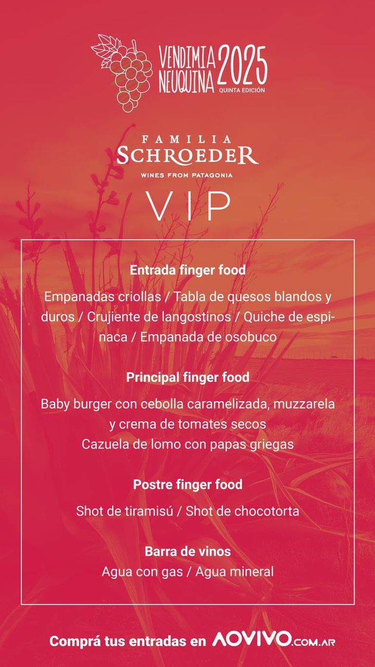 Para quienes buscan una experiencia premium, Bodega Schroeder ofrecerá un sector VIP con acceso preferencial al restaurante Saurus, donde se degustará un menú finger food que incluirá: