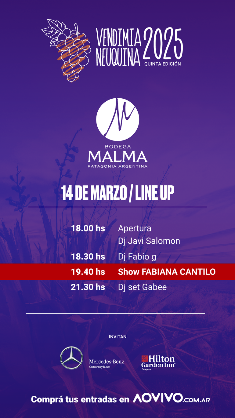 La apertura de puertas será a las 18:00 hs con el dj set de Javi Salomon, seguido por Fabio G a las 18:30 hs, quien pondrá ritmo a la tarde con su selección musical. A las 19:40 hs, el esperado show de Fabiana Cantilo llenará de magia la vendimia, y para cerrar la noche, Gabee tomará el control de los decks a las 21:30 hs hasta la media noche.
