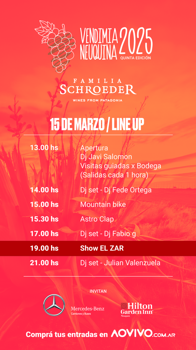 La tarde continúa con el dj set de Fabio G a las 17:00 hs, preparando el ambiente para el show de El Zar a las 19:00 hs, una de las bandas más esperadas de la vendimia. Para cerrar la jornada con la mejor energía, Julian Valenzuela se adueñará de la pista con su dj set a partir de las 21:00 hs.