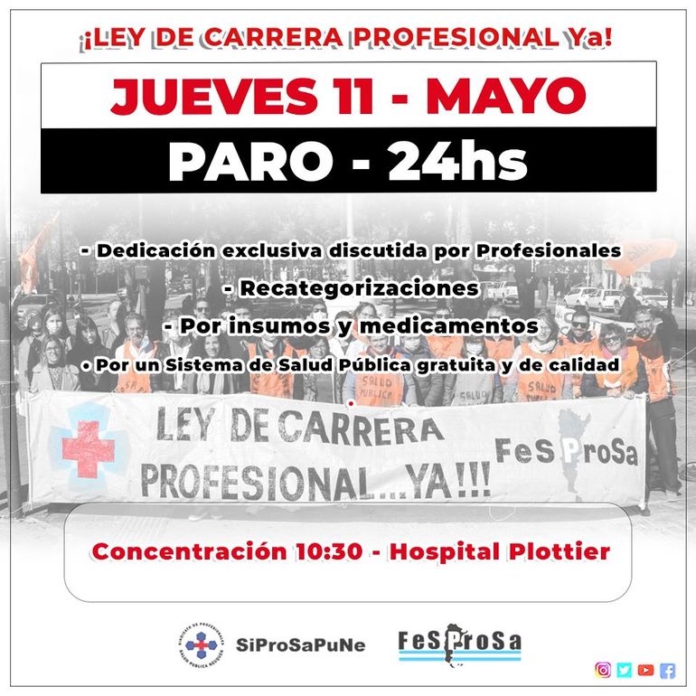 Cabe destacar que, para este jueves, Siprosapune y Fesprosa convocaron a un paro por 24 horas en reclamo de insumos y medicamentos, dedicación exclusiva de profesionales, recategorizaciones, la Ley de Carrera Profesional, el no desmembramiento del sistema público y el pedido de que el gobierno provincial los sume a la mesa de diálogo para debatir condiciones laborales y otros temas que afectan al sector.