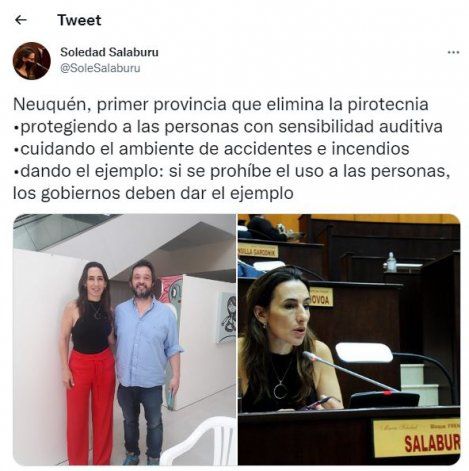 "A partir de un pedido expreso de Gendarmería nacional, de la policía de Neuquén, de Defensa Civil, de la Fiscalía de Delitos Medioambientales, de la secretaria de Recursos Faunísticos y de un montón de organizaciones por el cambio climático y muchas ONG vinculadas al medio ambiente, quienes se sumaron a nuestro pedido de prohibición de pirotecnia de estruendo, se sumó en la ley la prohibición de pirotecnia lumínica", explicó sobre la flamante norma.
