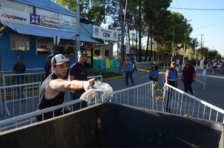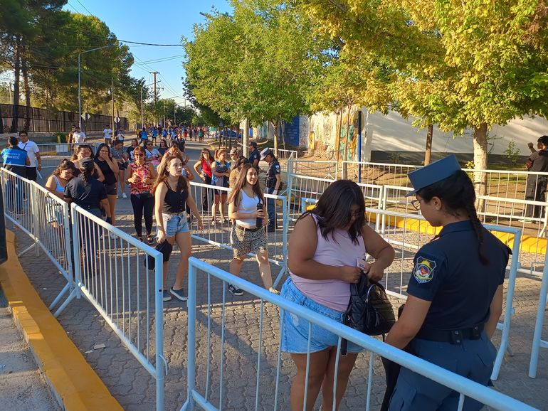 Desde temprano, los ingresos por calle Linares y Río Negro registraron filas de visitantes que esperaban para atravesar los cacheos reglamentarios. Por motivos de seguridad, desde la organización de la Fiesta de la Confluencia difundieron una lista de elementos prohibidos, con algunos elementos más obvios -como las armas- y otros más curiosos -como las camisetas de fútbol- que pueden ser retenidas en los filtros de ingreso.
