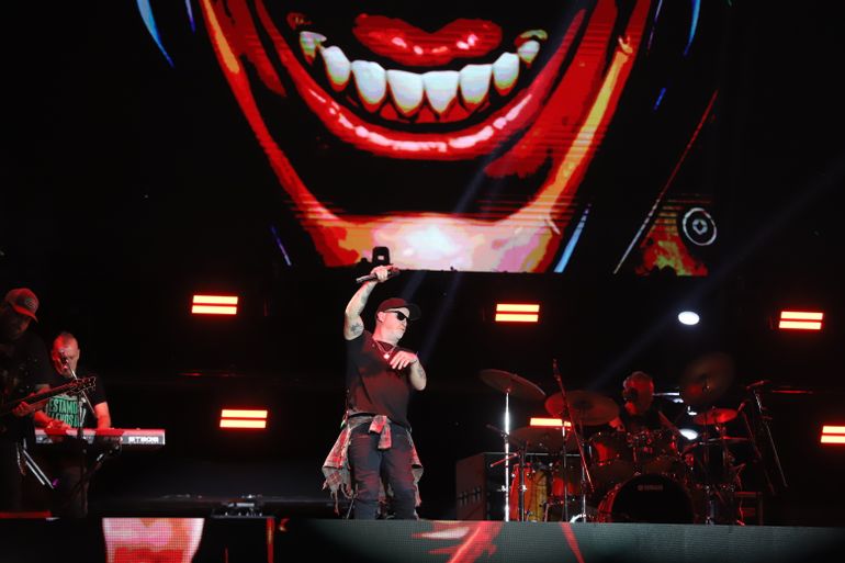 Con "El mono relojero", el Mono, el líder del grupo, recorrió toda la pasarela del escenario y se subió a la plataforma elevada para arengar al público que saltaba en un pogo feroz. "Esto es como un hotel cinco estrellas, aprovecho a usar todo", bromeó sobre el ambicioso despliegue del escenario mayor.
