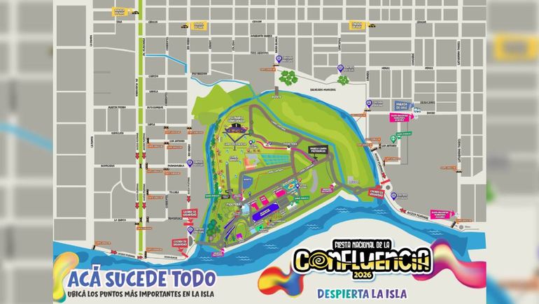 A pocos días del inicio de la edición 2026 de la Fiesta de la Confluencia, la Municipalidad de Neuquén difundió el mapa del evento, que tomará lugar en su sede habitual de la isla 132, a orillas del río Limay. Como ocurre cada año, los buenos contribuyentes y los que compren entradas para los shows tendrán un acceso preferencial más cercano al escenario, aunque el acceso al predio es gratuito y permite tener una buena visibilidad incluso desde el campo general.