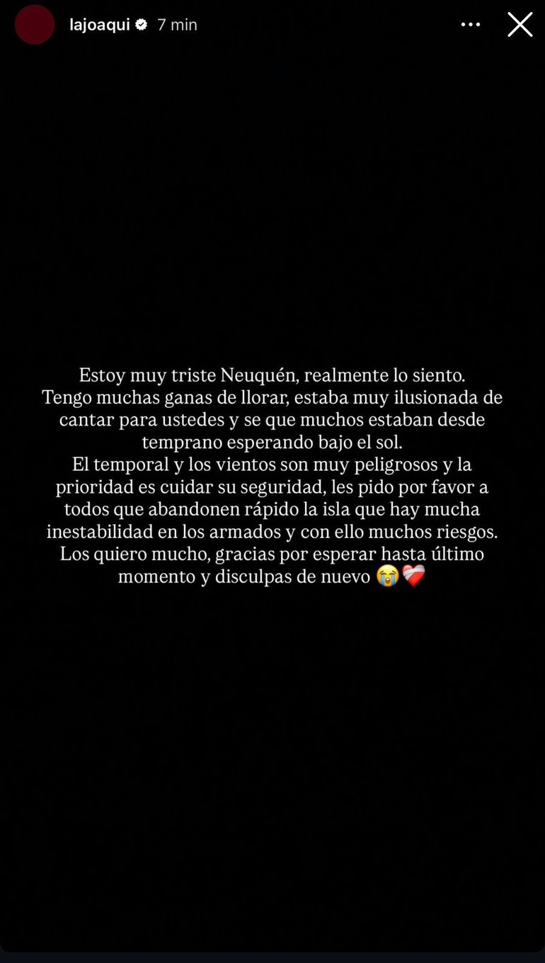 “Estoy muy triste Neuquén, realmente lo siento. Tengo muchas ganas de llorar, estaba muy ilusionada de cantar para ustedes y sé que muchos estaban desde temprano esperando bajo el sol”, comenzó diciendo en un texto que escribió minutos después de la cancelación de la última noche de la Fiesta de la Confluencia.