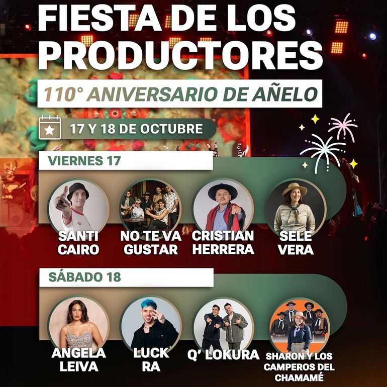 Luego de una espera que se hizo larga, este viernes 17 y el sábado 18 de octubre la ciudad de Añelo será sede de una nueva edición de la Fiesta Provincial de los Productores que se realizará en el predio ubicado en la calle 24 de esa localidad con la presencia de artistas locales, nacionales e internacionales.