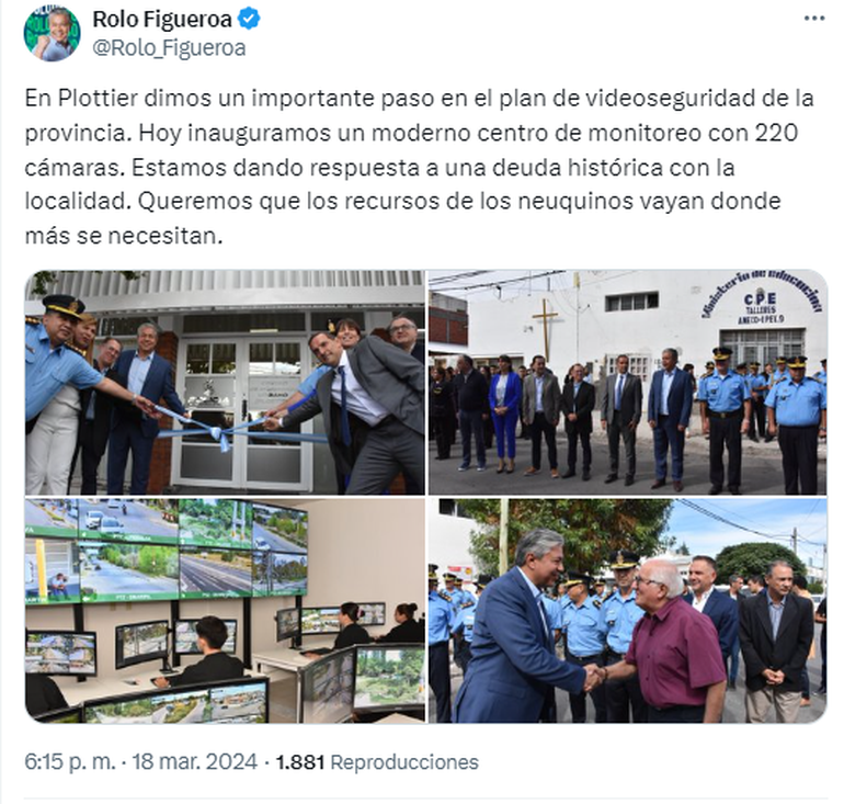 El gobernador sostuvo que el moderno centro de monitoreo responde a “una deuda histórica que se tiene con Plottier, que lleva muchos años reclamando la posibilidad de tener mejor seguridad. Es una ciudad que ha crecido explosivamente y a la cual no se había podido brindar la mirada que tenemos ahora, desde más de 200 cámaras en la ciudad”.