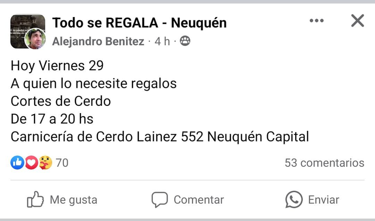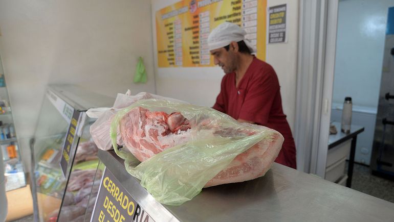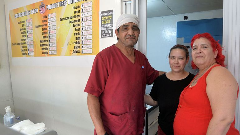 "Ya vino gente. No tengo mucho, pero estamos regalando", dijo el comerciante solidario Alejandro Benítez. Ofrece paleta de cerdo, codillos, chuletas, media cabeza...distintos cortes.