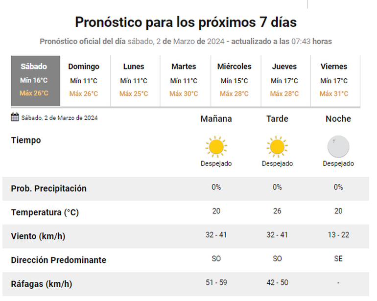 El Servicio Meteorológico Nacional (SMN) también anticipa una jornada soleada más fresca, con una mínima de 20 grados centígrados y una máxima de 26 C°. La probabilidad de alguna tormenta se dispersa pero aparece el viento, con alguna ráfaga.