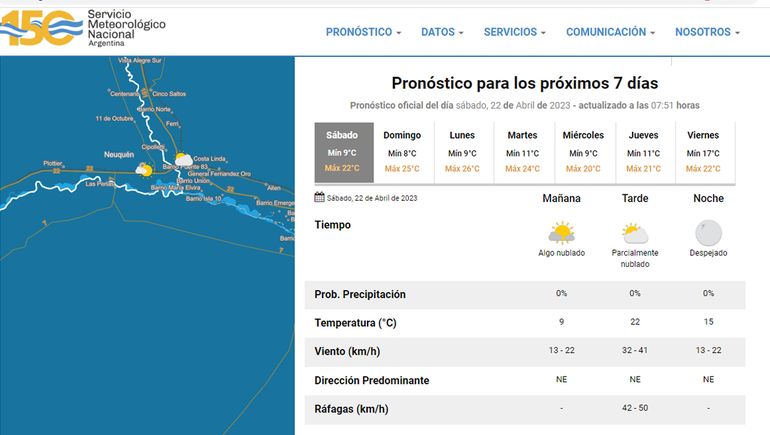 El Servicio Meteorológico Nacional (SMN) pronosticó para esta mañana cielo algo nublado y una temperatura de 9 grados, mientras que en horas de la tarde ascenderá a los 22 grados de máxima con viento de moderado a fuerte y ráfagas entre 42 y 50 kilómetros por hora. Hacia la noche estará despejado y la temperatura descenderá a los 15 grados. El viento por la noche será débil.